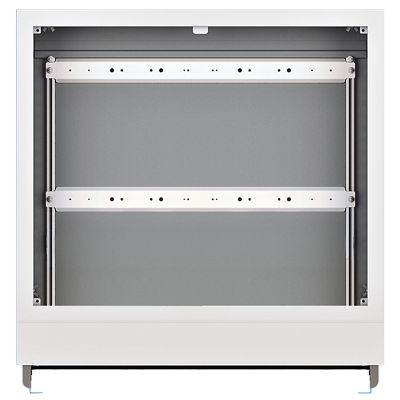 Einbauzarge aus feuerverzinktem Stahlblech Bautiefe 110 mm. Seitlich und oberhalb der Zarge mit universell ausbrechbaren vorgestanzten Rohrführungsblechen. Zwei verstellbare Montageschienen an der Rückwand zur Befestigung des ISX vormontiert, für DX-Serie beiliegend.