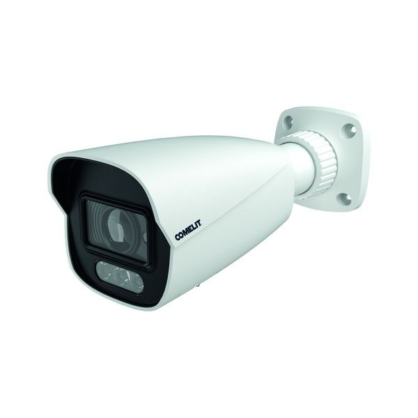 IP Kamera ColorUP Serie Next Bullet mit ereignisgesteuerten Abschreckungsfunktionen: blaue/rote LED Warnung und akustische Warnung über Sirenenlautsprecher oder voreingestellte/anpassbare Meldungen. Motorisiertes 2,8÷12 mm Objektiv, 4MP@30 fps Auflösung, Light LEDs mit 30 Meter Reichweite, IR LEDs mit 30 Meter Reichweite (Smart IR), ColorUp Funktion (Light LED), Dual Light (IR+Light LED mit Personen/Fahrzeug Unterscheidung) und IR LEDs. ONVIF-kompatibel. Funktionen zur Videoanalyse: Area Intrusion (Personen/Fahrzeug-Unterscheidung), Line Crossing (Personen/Fahrzeug-Unterscheidung), Funktion für verlassene/entfernte Objekte. WDR 120Db, Videokompression H.265+ / H.265 / H.264+ / H.264/ MJPEG, SD-Slot (max 256GB). Audio: 1 Eingang, 1 Ausgang, integriertes Mikrofon und Lautsprecher (Zweiwege-Audio). Aluminium-Druckgussgehäuse wasserdicht IP66, 12VDC-Stromversorgung/ PoE IEEE802.3af. Browser-kompatibel: Google Chrome/Edge/Firefox/Safari. Kompatibles Zubehör: JBA-BA, CMA-BA, WMA-BA, PMA-A, AMA-A.