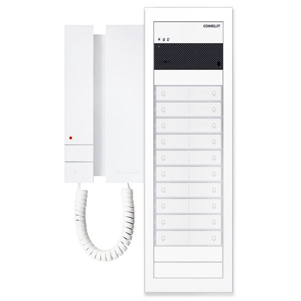 Paketlösung Ultra Audio inklusive Mini mit Hörer, SB2, UP, weiss. Es können maximal 4 Innenstationen Audio, pro Teilnehmer, installiert werden. Dieses Kit besteht aus: 1x UP-Gehäuse 3110/4A, 1x Unterputzrahmen UT9164W, 1x Lautsprecher Audio UT2010W, 3x Tastenmodul UT9200, 3x Tastenabdeckung Blind UT9221MW, 10x Tastenabdeckung UT9212, 1x Netzgerät 1210, 19x Innenstation Audio Mini mit Hörer 2738W/A.