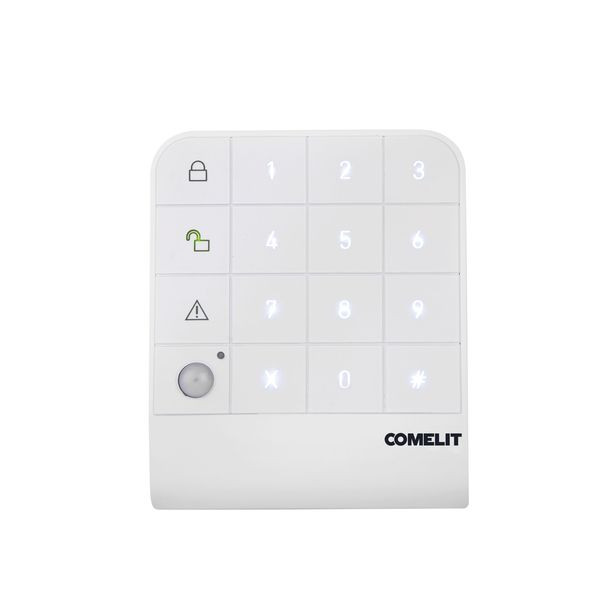 Codetastatur Zwei-Wege-Funk-Soft-Touch für die Verwaltung der Comelit Nexus-Alarmzentralen. Ausgestattet mit einem Näherungssensor und einem Helligkeitssensor für eine automatische Steuerung der Hintergrundbeleuchtung in Abhängigkeit von der tatsächlichen Nutzung und dem Umgebungslicht, wodurch die Akkulaufzeit optimiert wird. 4 Anzeige-LEDs (System aus, System ein, Störung und Alarm), Summer für akustische Signalisierung und Manipulationsschutz. Spannungsversorgung über zwei CR123A-Batterien. Abmessungen: 102 x 84 x 25 mm.