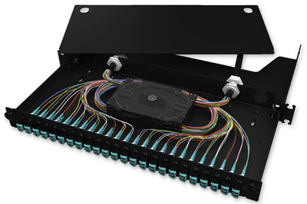 Everon® LAN1 Glasfaser Verteilerfeldgehäuse, vorbestückt mit selbstschließenden LC UPC Duplex Adaptern und Pigtails, 24 Fasern, 1 HE, SMF-28® Ultra Faser, universelle Spleißpakete für Schrumpf-/Krimpspleißschutz, ohne Spleißschutz, schwarz