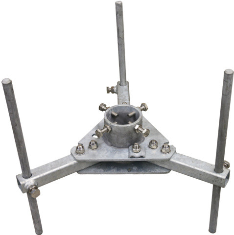 Dreibeinstativ platzsparend, höhenverstellbar und klappbar zur Aufnahme von Fangstangen und Stützrohre Ø40 mm und Ø50 mm. Ausgleich von Dachschrägen bis 10° möglich. Aufnahme von bis zu vier Betonsockel je Bein möglich.