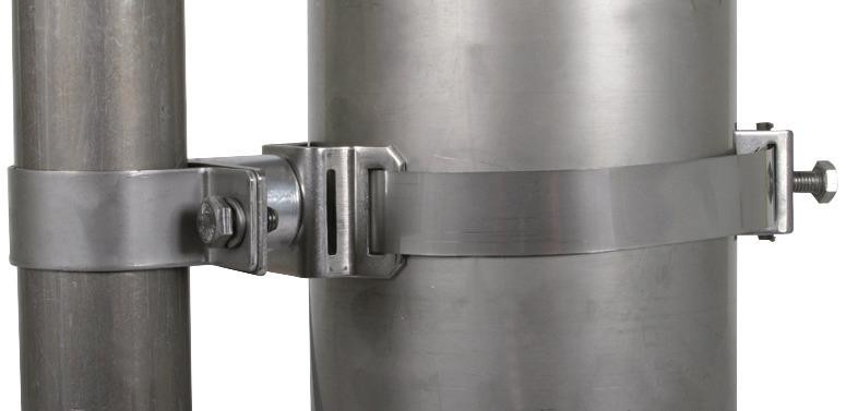 Befestigungsschelle mit Spannband, zum Befestigen der Stützrohre DEHNiso-Combi z. B. am Antennenstandrohr oder anderen Rohren. Ausführung mit Distanzstück Länge 30 mm, um Halterungen von z. B. Antennen auszugleichen.