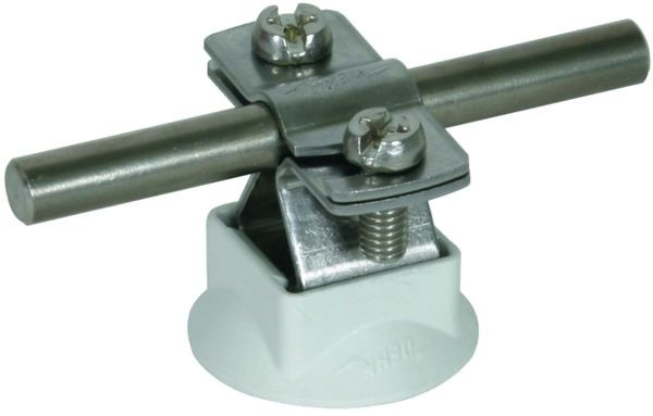 Leitungshalter DEHNhold mit geschlitztem Überleger, zum Befestigen von Rundleitern. Einsetzbar für verschiedene Werkstoffe z. B. Al, NIRO, St/tZn und Cu, feste Leitungsführung. Ausführung mit Innengwinde, vormontiert mit Kunststoffsockel.