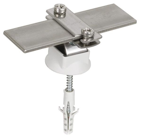 Flachbandhalter DEHNhold mit geschlitztem Überleger, zum Befestigen von Flachleitern. Einsetzbar für verschiedene Werkstoffe z. B. Al, NIRO, St/tZn und Cu, feste Leitungsführung. Ausführung vormontiert mit Schraube, Kunststoffsockel und Dübel.