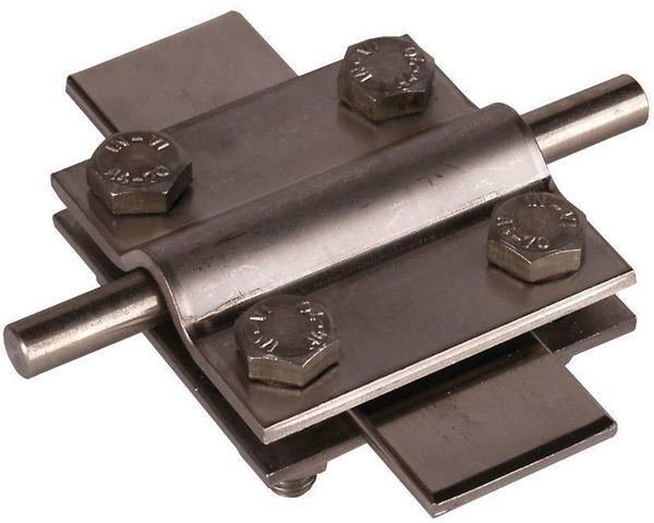 Kreuzstück nach DIN EN 62561-1, für ober- und unterirdische Verbindung von Rund- und Flachleitern. Ausführung ohne Zwischenplatte mit Schrauben M8.