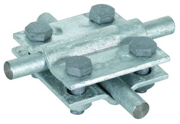 Kreuzstück nach DIN EN 62561-1, für ober- und unterirdische Verbindung von Rund- und Flachleitern. Ausführung ohne Zwischenplatte mit Schrauben M8.