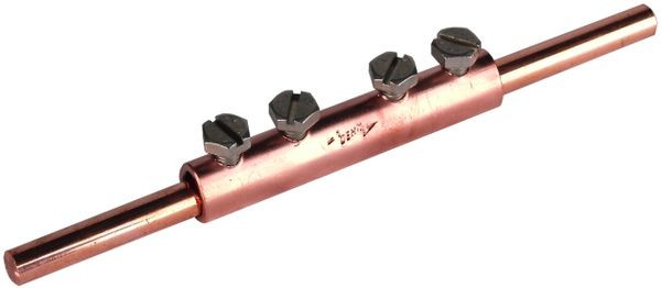 Verbindungsmuffen nach DIN EN 62561-1, für den Zusammenschluss von zwei Rundleitern in Längsanordnung mit vier Schrauben M6. Ausführung Cu 8.