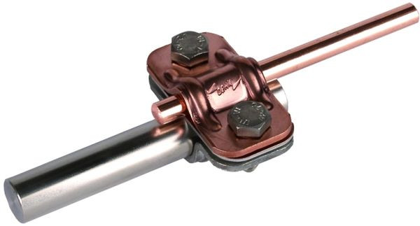 UNI-Trennklemme nach DIN EN 62561-1, zum Verbinden der Ableitung mit der Erdeinführung. Ausführung Zweimetall, für Rundleiter Cu und Erdeinführungsstange St/tZn oder NIRO (V4A).