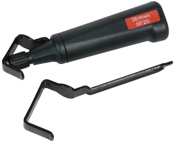 DEHNhelix Werkzeug zum Abmanteln des zusätzlichen grauen Mantels der HVI light Leitung und HVI Leitung mit einem Außendurchmesser von 20 mm bzw 23 mm. DEHNhelix besteht aus einem Handgriff und zusätzlich wechselbarem Bügel (je nach Durchmesser der Leitung).