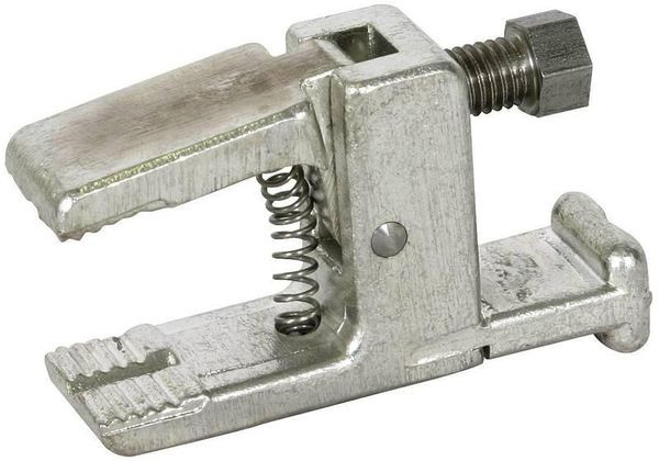 Kompaktklemme mit Federvorspannung. Mit T-Anschlussbolzen und Sechskant-Feststellschraube SW10. Zum Einsetzen mittels Erdungsgriff VI und Befestigen mittels Drehgriff mit flexibler Spindel.