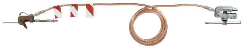 Einpolige Erdungs- und Kurzschließvorrichtung nach DIN VDE 0683-100 (EN/IEC 61230) für Oberleitungen elektrischer Bahnen,; 8,5 m lang, mit Fahrdraht-Erdungsklemme und Schienenanschlussklemme (Knebel) bestückt.