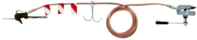 Einpolige Erdungs- und Kurzschließvorrichtung nach DIN VDE 0683-100 (EN/IEC 61230) für Oberleitungen elektrischer Bahnen,; 8,5 m lang, mit Fahrdraht-Erdungsklemme und Schienenanschlussklemme (Ratsche) bestückt.