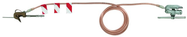 Einpolige Erdungs- und Kurzschließvorrichtung nach DIN VDE 0683-100 (EN/IEC 61230) für Oberleitungen elektrischer Bahnen,; 12 m lang, mit Fahrdraht-Erdungsklemme und Schienenanschlussklemme (Knebel) bestückt.