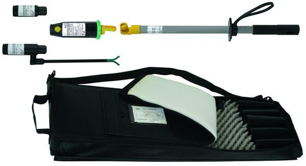 Abstands - Spannungsprüfer ASP zum allpoligen Feststellen der Spannungsfreiheit an der Arbeitsstelle nach DIN VDE 0105-100 (EN 50110-1) in elektrischen Anlagen. Kategorie "S" und "L" für Freileitungen und Freiluftschaltanlagen. Auch bei Niederschlägen verwendbar. Mit optischer und akustischer Anzeige und Eigenprüfvorrichtung, inklusive Transportbehälter.