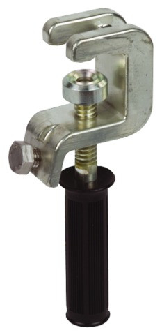 Universalerdungsklemme mit Handgriff aus Kunststoff als erdseitiges Anschlusselement nach DIN VDE 0683-100 (EN/IEC 61230) für Kugelfestpunkte, T-Festpunkte, Flach- und Rundleiter zur erdseitigen Bestückung von Erdungs- und Kurzschließseilen. Mit Verdrehungsschutz Ausführung PK 1.