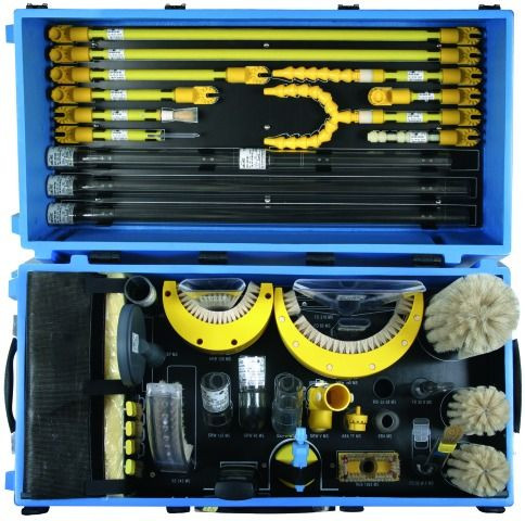 Kombi-Reinigungsset TFRS MS in Anlehnung an DIN VDE 0681-1und DIN VDE 0682-621 mit Zahnkupplung DIN VDE 0682-211 (EN/IEC 60832) zum Trocken- und Feuchtreinigen unter Spannung bis 36kV / 15 ... 60 Hz für Innenraum- und Freiluftanlagen, komplett im Kunststoffkoffer. Kombination aus Trocken- und Feuchtreinigung zum Reinigen unter Spannung ergibt beste Ergebnisse. Transparente Saugrohre für höhere Sicherheit. Universalzahnkupplung zum einfachen Austausch und Abwinkeln der Arbeitsköpfe. Starre und flexible Arbeitsköpfe in Stecktechnik zum einfachen und schnellen Schwammaustausch.