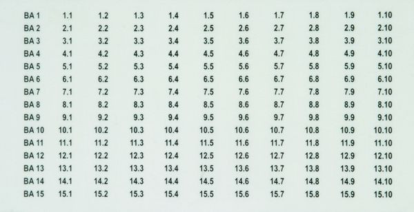 2x 165 Klebeetiketten zum Kennzeichnen der Busadresse für Überwachungsgeräte DRC MCM XT (BA1 bis BA15) und der laufenden Nummer für die zugeordneten BXT-Basisteile oder -Module, (1.1-1.10 bis 15.1-15.10).