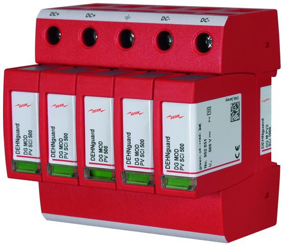 Mehrpoliger Überspannungsableiter DEHNguard M PV2 SCI, Typ 2 nach EN 61643-31 zum Schutz von 2 MPP-Eingängen. Die dreistufige DC-Schaltvorrichtung, bestehend aus Basisteil und gesteckten Schutzmodulen, mit kombinierte Abtrenn- und Kurzschließvorrichtung mit sicherer elektrischer Trennung im Schutzmodul. Zum Schutz von Niederspannungs-Verbraucheranlagen vor Überspannungen. Zum Einsatz gemäß IEC 60364-7-712:2002-05 (Errichten von Photovoltaik-Versorgungssystemen).