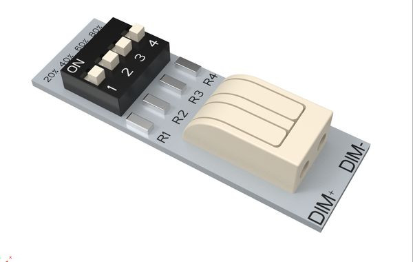 Mit diesem Modul können Leuchten mit einem 1-10V bzw. widerstandsgeregelten Anschluss gedimmt werden. zum Dimmen auf 80%, 60%, 40% oder 20% - für 1-10V Geräte einfach an die Dimmleitungen anschließen und gewünschten Wert über die Schalter einstellen passend für DOTLUX PLAZA, DOLPHIN