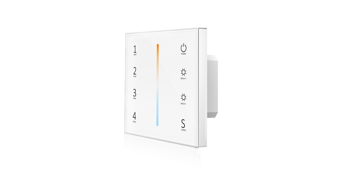 Touch Panel 4 Zone DMX512 Master Sensitives Touchpanel mit Touch-Regler in der Mitte. Der DMX-Signalausgang entspricht dem Standardprotokoll 512 und ist mit DMX-Decodern beliebiger Hersteller kompatibel. DMX Ausgang: 4 Zonen (belegt DMX-Kanäle 1-4) Funk: DOTLUX Fusion Technology Geeignet für Farbtemperatur Anwendungen