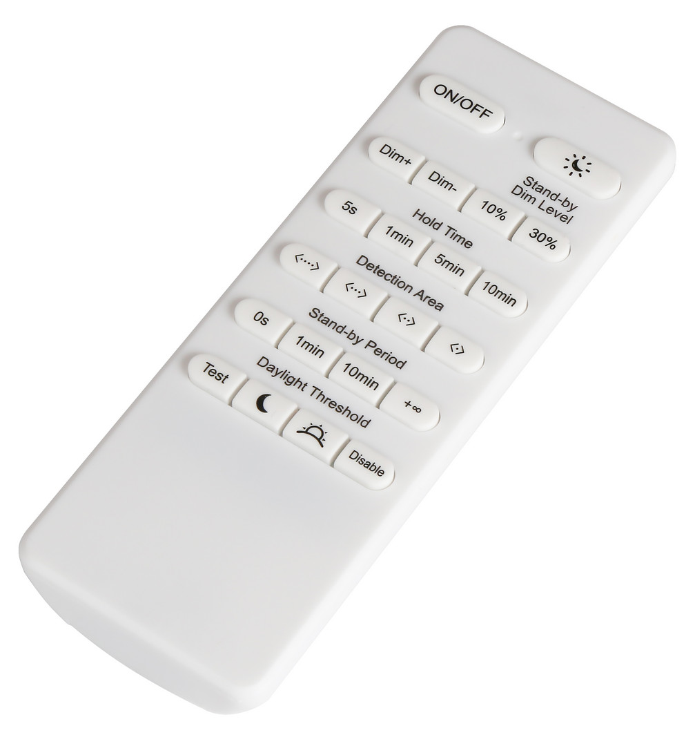 Fernbedienung für DOTLUX SURFACEsensor und SURFACEsensor-exitDiese Fernbedienung wird benötigt um den Bewegungssensor und den Tageslichtsensor der SURFACEsensor Leuchten einzustellen. Sie benötigen nur eine Fernbedienung für beliebig viele Leuchten Die Fernbedienung muss auf die Leuchte gerichtet werden, um Einstellungen zu verändern (Infrarot) Die Leuchte quittiert optisch durch ein blinken die EinstellungEs können folgende Werte eingestellt werden: Reichweitenbereich in 3 Stufen (100%, 75%, 50%, 25%) 3-5m Tageslichtsensor in 3 Stufen (Aus, 15Lux, 50Lux) Leuchtdauer ( 5sek, 1min, 5min, 10min) Standby Helligkeit ( AUS, 10%, 30%) Standby Zeit ( 1min, 10 min, dauerhaft) Nachtlicht (3% Standby) Sensor (An, Aus)