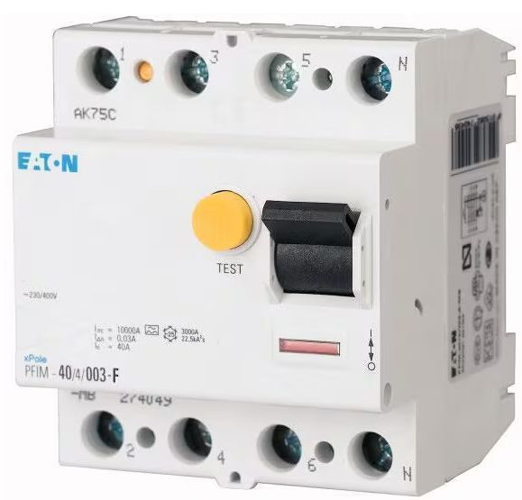 Fehlerstrom-Schutzschalter PFIM-F, 4-polig, Bemessungsstrom In: 40 A, Bemessungskurzschlussfestigkeit Icn: 10 kA mit Vorsicherung kA, Bemessungsfehlerstrom I?N: 0,03 A, Schaltgeräte für den Wohnungsbereich und kommerzielle Anwendungen