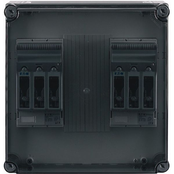 NH-Verteilerschrank mit transparentem Deckel, 2x Schaltanlage NH00 auf Sammelschienensystem 630 A, 3-polig, Träger inklusive für N+PE zum Nachrüsten, mit Kupferschienen L1/L2/L3: 30 x 10 mm, N: ohne, PE: ohne, ohne Klemmen