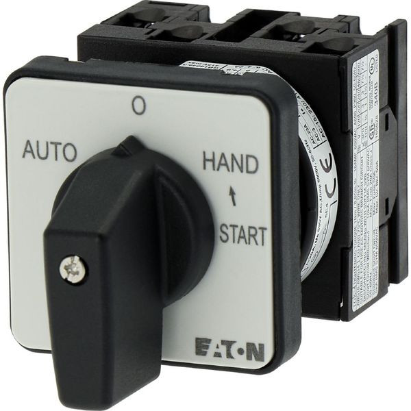 Umschalter, Sortiment: Steuerschalter, Normen und Bestimmungen: IEC/EN 60947, VDE 0660, IEC/EN 60204, CSA, UL, Lasttrennschalter nach IEC/EN 60947-3, Typkenner: T0, mit schwarzem Knebel und Frontschild, Kontakte: 4, Tastend: Mit Rückzug von START, Schutzart: Front IP65, Bauform: Einbau, Schaltwinkel: 45 °, Schaltverhalten: tastend/rastend, mit 0-Stellung, Mit Rückzug nach MANUAL, 2 Baueinheit(en), Bemessungsdauerstrom: Iu= 20 A, Frontschild: AUTO-0-HAND