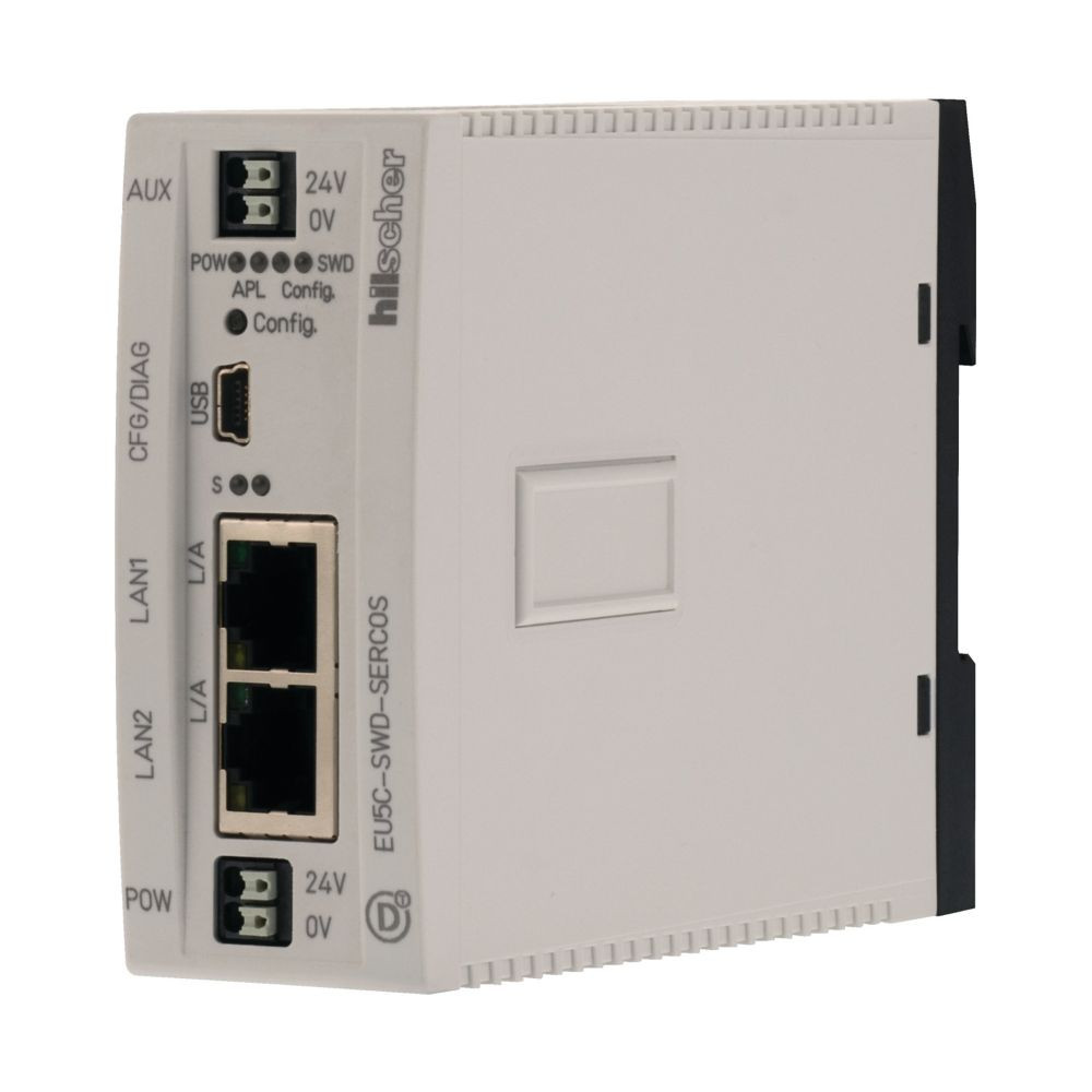 SmartWire-DT-Gateway zum Anschluss von bis zu 99 SmartWire-DT-Modulen an ein industrielles Ethernet-Netzwerk und zur Versorgung der SmartWire-DT-Module und -Schaltgeräte. Der Anschluss an Sercos erfolgt über den integrierten 100MBit Ethernet Switch als Slave. Das Gateway verfügt über eine separate USB-Diagnose-Schnittstelle.