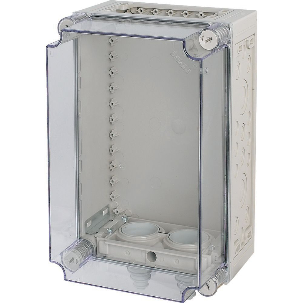 Leergehäuse Stromverteiler mit montierten Kabelstutzen, Material: Polycarbonat, schlagfest, Schutzart IP65, patentierter Deckelverschluss mit integriertem Überdruckausgleich, Gehäuseseitenwände geschlossen, ausschlagbar, Wände oben oder unten offen, Leitungen von vorne einlegbar durch geteilte Kabelschellen, plombierbare Deckelverschlüsse, RAL 7035, Grau (Sockel), transparent rauchgrau, (Abdeckung), Einbautiefe bei Montageplatte=200mm, Abdeckungstyp: transparent rauchgrau, Ausführung Unterteil: oben offen unten Kabelstutzen
