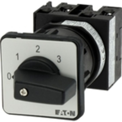 Stufenschalter, Sortiment: Steuerschalter, Normen und Bestimmungen: IEC/EN 60947, VDE 0660, IEC/EN 60204, CSA, UL, Lasttrennschalter nach IEC/EN 60947-3, Typkenner: T0, mit schwarzem Knebel und Frontschild, Kontakte: 3, Stufenanzahl: 3 Stufen, 45°, Schutzart: Front IP65, Bauform: Zentraleinbau, Schaltwinkel: 45 °, Schaltverhalten: rastend, mit 0-Stellung, 2 Baueinheit(en), Bemessungsdauerstrom: Iu= 20 A, Frontschild: 0-3