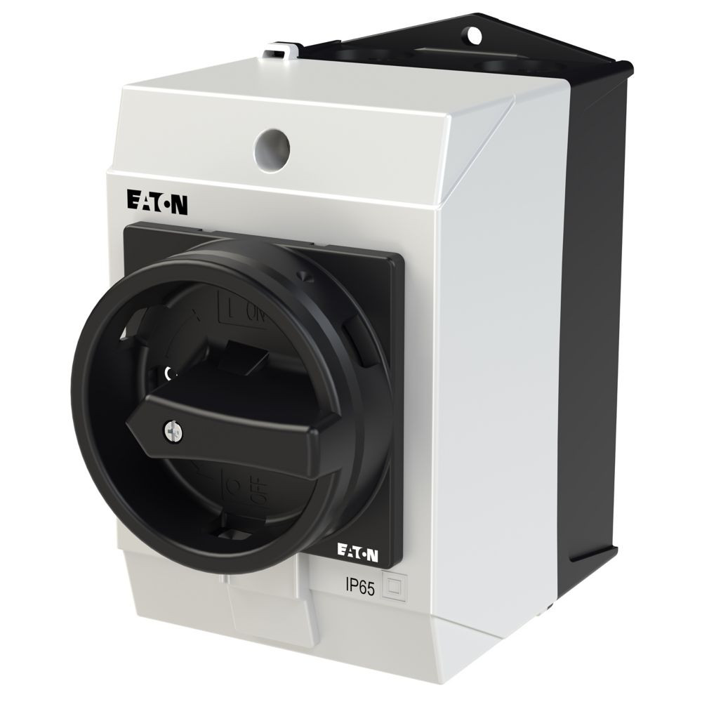 Hauptschalter, Sortiment: Hauptschalter, Wartungsschalter, Reparaturschalter, Typkenner: T0, Stopp-Funktion: STOPP-Funktion, mit schwarzem Drehgriff und Sperrkranz, 6-polig, Verriegelungsvorrichtung: In der Position 0 (Aus) verriegelbar, Schutzart: IP65, Bauform: Oberflächenmontage, Schaltwinkel: 90 °, Bemessungsbetriebsleistung AC-23A, 50 - 60 Hz 400 V: P = 5,5 kW, Bemessungsdauerstrom: Iu = 20 A, 4 Baueinheit(en), Normen und Bestimmungen: IEC/EN 60947, VDE 0660, IEC/EN 60204, Lasttrennschalter nach IEC/EN 60947-3