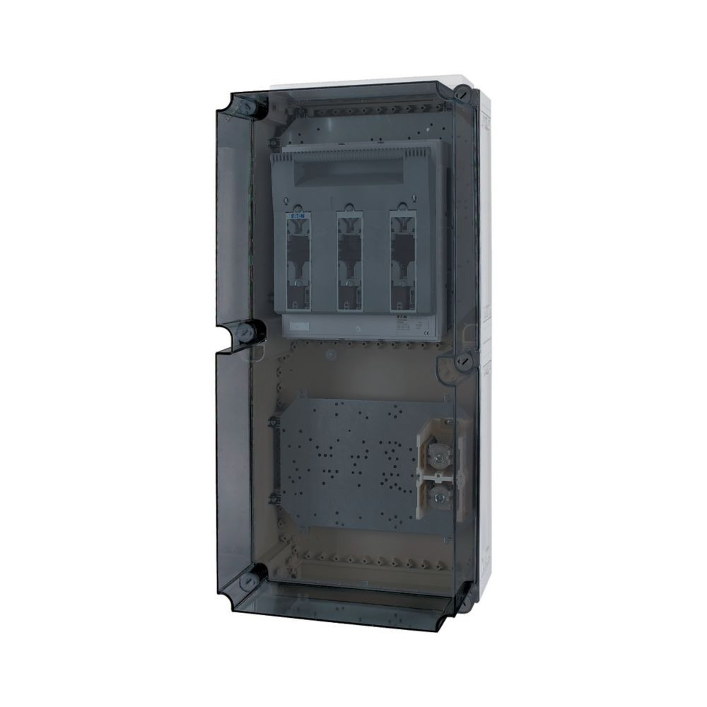 Einzelgehäuse mit 1x NH Sicherungs-Lasttrennschalter, Material Polycarbonat, schlagfest, Schutzart IP65, Seitenteile glänzend, oben und unten mit FL4-X-Flansch, Sicherungssockel auf Montageplatte aus 3-mm-Stahlblech, Befestigungslasche zur Wandmontage, Plombierbare Deckelverschlüsse, Kappe transparent rauchgrau, Klammer für den Anschluss des 4. Leiters (PE/N), Bemessungsbetriebsstrom Ie = 550 A, Sicherungseinsatz NH3, Nachrüstbare Klemme für den 5. Leiter = K240/1, Sicherungseinsätze müssen einzeln bestellt werden.
