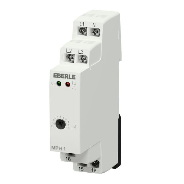Das Phasenfolgerelais für Drehstromnetze überwachen die Folge der Phasen L1, L2 und L3 sowie den Ausfall einer oder mehrerer Phasen. Bei korrekter Phasenfolge und Spannung (> 173 V ) ist das Ausgangsrelais geschlossen. Bei falscher Phasenfolge oder bei Phasenausfall öffnet sich das Relais. Die fixe Verzögerung T1 beträgt 500 ms und einstellbare Verzögerung T2 0,1 bis 10 s. Falls die Versorgungsspannung unter 60 % der Un fällt, kommt es zur sofortigen Relaisabschaltung, ohne Verzögerung und Fehlerzustand wird durch rote LED gemeldet.
