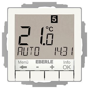 | Kurzbeschreibung | UP-Uhrenthermostat als Raumregler, RAL9010 glänzend 55x55, AC 230V, 1Schliesser, 10 A, Hinterleuchtung weiss |