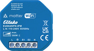 Universal-Dimmaktor mit IP, Matter über Wi-Fi, optional EnOcean. Mit Power MOSFET. Dimmbare 230?V-LED-Lampen in der Betriebsart 'Phasenabschnitt' bis 300?W, bzw. in der Betriebsart 'Phasenanschnitt' bis 100?W, abhängig von den Lüftungsverhältnissen. 230?V-Glüh- und Halogen-Lampen bis 300?W, abhängig von den Lüftungsverhältnissen. Keine Mindestlast. REST-API. Stand-by-Verlust nur 0,7 Watt. Für Einbaumontage. 46?x?45 ?mm, 20 mm tief. Die Anschlussklemmen sind Schraubklemmen für Leiterquerschnitte bis 2,5?mm². Schaltung mit Soft-Ein und Soft-Aus zur Lampenschonung. Versorgungs-, Schalt- und Steuerspannung örtlich 110-240?V. Die eingestellte Helligkeitsstufe bleibt beim Ausschalten gespeichert (Memory). Automatische elektronische Überlastsicherung und Übertemperatur-Abschaltung.Mit Steuereingang für einen eventuell davor montierten Steuertaster oder Schalter. Ein Glimmlampenstrom ist nicht zugelassen. Die Wi-Fi-Verbindung nutzt das 2.4 GHz Frequenzband und ermöglicht Over-the-Air-Updates (OTA). Dieser Aktor ist Matter-zertifiziert und kann daher in verschiedene Ökosysteme eingelernt und parallel betrieben werden. Zur Steuerung u¨ber Matter wird, je Ökosystem, ein kompatibler Matter-Controller benötigt. Für Apple Home z.B. ein Homepod mini, für Amazon Alexa z.B. ein kompatibler Echo Dot und für Google Home z.B. ein Nest mini. Die optionale Konfiguration des Aktors erfolgt über die ELTAKO Connect-App. Eine Entwicklungsversion der REST-API nach OpenAPI Spezifikation steht über die Online-Produktseite des Gerätes zur Verfügung. Diese wird fortlaufend weiterentwickelt. Der Funktionsumfang kann durch Aufsteckadapter erweitert werden. Der EnOcean-Adapter (EOA64) ermöglicht den Zugang zum EnOcean-Ökosystem. Weitere Information diesbezüglich auf der Produktseite des jeweiligen Adapters.