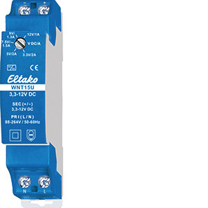 Universal-Weitbereichs-Schaltnetzteil. Mit 5 einstellbaren Ausgangsspannungen 3,3V/2A, 5V/A, 7,5V/1,5A, 9V/1,3A, 12V/1A. Stand-by-Verlust nur 0,1 Watt. Reiheneinbaugeräte für Montage auf Tragschiene DIN-EN 60715 TH35. 1 Teilungseinheit = 18mm breit, 58mm tief. Bei einer Belastung größer als 50% der Nennleistung und immer bei nebeneinander liegenden Schaltnetzteilen und bei Dimmern ist beidseitig 1/2 Teilungseinheit Lüftungsabstand mit den Distanzstücken DS12 erforderlich. Wirkungsgrad 86%. Weitbereichs-Eingangsspannung 88-264VAC (110V -20% bis 240V +10%). Stabilisierte Ausgangsspannung ±1%, geringe Restwelligkeit. Kurzschlussfest. Überlast- und Übertemperatursicherung durch Abschalten mit automatischem Zuschalten nach der Fehlerbeseitigung (Autorecovery-Funktion).