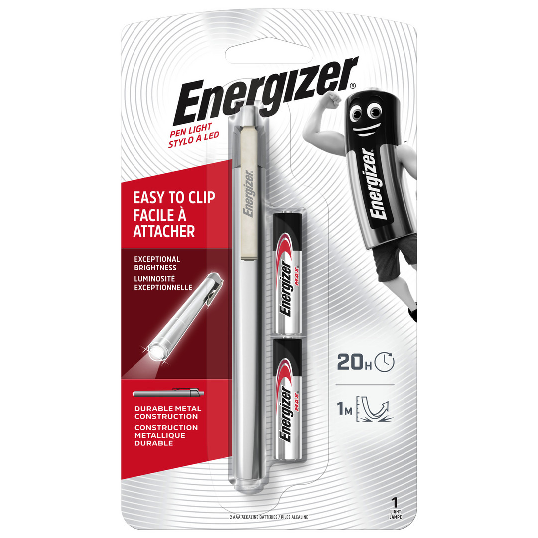 Mit der Energizer-LED-Stiftlampe haben Sie immer eine kleine Lampe dabei. Diese kompakte, leichte und zuverlässige Stiftlampe aus Metall hat es wirklich in sich. Ihr gerichtetes Licht mit 35 Lumen ist 4x heller als LED-Standardtechnologie. Mit einer Betriebsdauer von bis zu 20 Stunden können Sie sicher sein, dass diese Mini-Taschenlampe für Sie da ist, wenn Sie sie brauchen – ob beim Heimwerken oder bei der Suche nach Ihrem Telefon unter dem Autositz. Dank des leicht zu bedienenden rückwärtigen Schalters lässt sie sich bequem ein- und ausschalten. Sie ist der perfekte Begleiter im Alltag und kann mithilfe eines Stahlclips sicher an der Tasche, Handtasche oder am Rucksack befestigt werden. Die robuste Metallkonstruktion übersteht Stürze aus einer Höhe von bis zu 1 Meter. Diese LED-Mini-Taschenlampe ist unglaublich nützlich – ob im Büro, bei der Arbeit oder unterwegs. Die Energizer-LED-Stiftlampe ist der kompakte, leichte und zuverlässige Performer, der bequem in Ihre Tasche passt. Inklusive 2 Energizer MAX AAA-Batterien