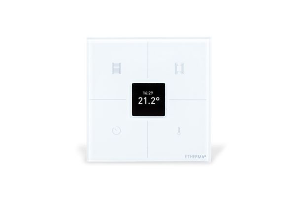 eTOUCH hybrid ist das neueste Design-Einbauthermostat von ETHERMA, das sich durch die energieeinsparende Selbstlernfunktion, besondere Bedienerfreundlichkeit und das elegante Infinity Design auszeichnet. Der Regler verfügt über ein hochwertiges LED-Glas-Touchdisplay und kann dank zwei Relaisausgängen gleichzeitig 2 Heizungen steuern - jeweils wahlweise mit Timerfunktion (bis zu 3h) oder Wochenprogrammierung . Es ist zudem Ökodesign-Richtlinien konform. Farbe: weiß, Maße: 90x90 mm, Temperaturbereich: 18-27 °C, Schaltstrom: 16 A total, Spannung: 230 V, Gangreserve: Zeiteinstellung 3 min., Montage: auf UP-Schalterdose, Schutzart: IP 21, Prüfzeichen: CE konform.