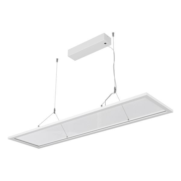 LED Pendelleuchte für verschiedene Anwendungsbereiche, wie z. B. flächendeckende, aber auch effektvolle Beleuchtungen in Flur, Wohnzimmer, Büro und vieles mehr. Durch den großflächigen Lichtaustritt entsteht immer eine sehr homogene Ausleuchtung. Die Leuchte kann auch über eine Zentralbatterie betrieben werden, mit einer Eingangsspannung von 198-280V/DC. Mittels Schalter kann eine von zwei möglichen Farbtemperaturen eingestellt werden. Die möglichen Farbtemperaturen und daraus resultierenden Lumen sind: 40W: 3000K (4800lm) und 4000K (5000lm). 50% des Lichtanteils entfallen auf das Downlight, 50% auf das Uplight. Die Leuchte ist zudem Flicker-free. Die Kabel der Seilabhängung sind 1,50m lang. Die Gehäusefarbe entspricht RAL9016. L80B10 bei 50000h. Protokoll: DALI2, DT6, Push-dim.