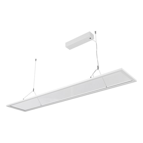 LED Pendelleuchte für verschiedene Anwendungsbereiche, wie z. B. flächendeckende, aber auch effektvolle Beleuchtungen in Flur, Wohnzimmer, Büro und vieles mehr. Durch den großflächigen Lichtaustritt entsteht immer eine sehr homogene Ausleuchtung. Die Leuchte kann auch über eine Zentralbatterie betrieben werden, mit einer Eingangsspannung von 198-280V/DC. Mittels Schalter kann eine von zwei möglichen Farbtemperaturen eingestellt werden. Die möglichen Farbtemperaturen und daraus resultierenden Lumen sind: 54W: 3000K (6480lm) und 4000K (6750lm). 50% des Lichtanteils entfallen auf das Downlight, 50% auf das Uplight. Die Leuchte ist zudem Flicker-free. Die Kabel der Seilabhängung sind 1,50m lang. Die Gehäusefarbe entspricht RAL9016. L80B10 bei 50000h. Protokoll: DALI2, DT6, Push-dim.