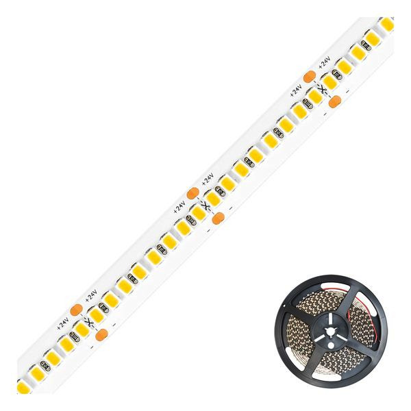 Kürzbarer und flexibler LED-Strip mit hochleistungs LED-Chips. Die auf diesem Strip verbauten superbright LED-Chips erreichen im Vergleich zu herkömmlichen LED-Chips eine deutlich höhere Lichtausbeute bei gleicher Leistungsaufnahme, bzw. vergleichbare Lichtausbeute bei geringerer Leistungsaufnahme. Dadurch lassen sich die verschiedensten Anwendungen, wie z. B. direkte oder indirekte Beleuchtung für Wohnzimmer, Schlafzimmer, Flur, etc. noch Energiesparender umsetzen. Auch Projekte mit gehobenen Ansprüchen bezüglich der Lichtausbeute lassen sich mit diesen Strips realisieren. Wichtig: Um ein überhitzen des Strips zu vermeiden, darf dieser nur auf Wärmeleitenden Untergründen verbaut werden, vorzugsweise in Aluminiumprofilen. Exaktes Binning erlaubt Farbtoleranzen von maximal +/-50K. Die Lichtausbeute beträgt 3940lm pro Meter.