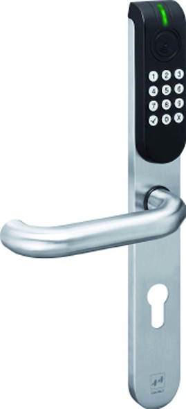 Elektronischer Türcodebeschlag ESA500, U-Form-Drücker, Zugangsfunktion durch Tastatur (PIN-Code), vier- oder sechsstellige Tür-Codes, bis zu 99 Benutzercodes, keine Verkabelung nötig, Stromversorgung über eine 3 V-Batterie, vielseitige Freigabeoptionen: Office- / Boten- / Hotelfunktion, 8 mm Vierkant; 40-50 mm Türblatt, 72 mm Entfernung