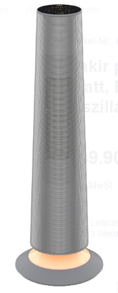 PTC-Heizelement, LED-Touch-Display, digitale Temperaturkontrolle ermöglicht eine präzise Einstellung zwischen 15 und 35 °C, Eco-Funktion passt die Heizleistung automatisch an die Raumtemperatur an, 80° Oszillation, 2 Heizstufen, Lüfterstufe, Übertemperaturschutz, Kippsicherung, Ambiente-Licht im Standfuß, Tragegriff, 24 Std. Timer