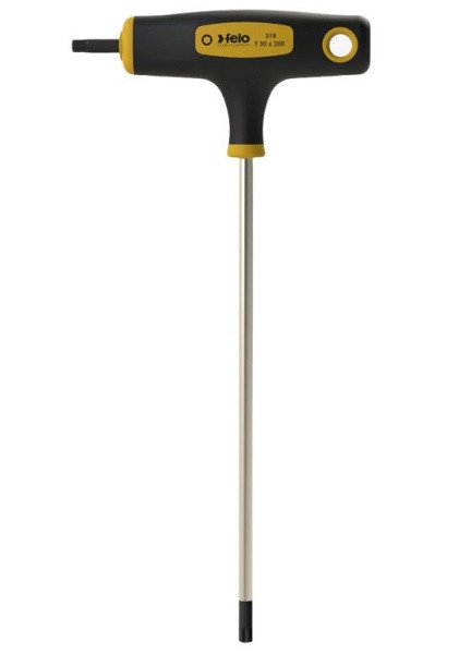 Felo 31830760 Doppel-Torx-T-Griff, T30 x 200 mm Langes Ende für präzises Eindrehen schwer zugänglicher Schrauben. Kurzes Griffende für hohes Drehmoment. Aufhängeöse für einfache Aufbewahrung. Ergonomischer 2-Komponenten-Griff mit Softgrip-Beschichtung reduziert Druckstellen. Robuster Kunststoffkern für Langlebigkeit, auch bei höchstem Drehmoment. Matte Chrombeschichtung mit schwarzen Spitzen. Griffbreite: 100 mm. Klingenlänge: 200 mm. Oberfläche : Satiniertes Chrom-Finish Griffmaterial : Mehrkomponentenmaterial Einzeln / Set : Einzelwerkzeuge Spitzenform : Torx Spitzengröße : Torx T30
