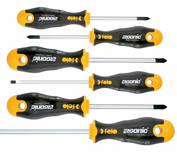 Felo 40096118 Ergonomisches Schlitz-/Kreuzschlitz-/Pozidriv-Schraubendreher-Set, 6-teilig Ergonic ist der erste Griff, der sich der Hand des Benutzers anpasst. Der durchgehende, stoßfeste Griffkern ist mit elastischen, kratzfesten Zellen aus hochflexiblem Kunststoff beschichtet. Glatter, nahtloser Griff für maximalen Komfort. Hand- und Griffverriegelung für weniger Belastung. Anti-Roll-Griffdesign. Klingen aus Chrom-Molybdän-Vanadium-Stahl. Überlegenes Drehmoment, das die DIN- und ISO-Anforderungen um bis zu 100 % übertrifft. Schwarze Spitze für präzisen Schnitt. Set beinhaltet: Schlitz: 4,0 x 100 mm, 6,5 x 150 mm; Pozidriv: PZ1 x 80 mm, PZ2 x 100 mm ; Phillips: PH1 x 80 mm, PH2 x 100 mm Griffmaterial: Mehrkomponentenmaterial Einzeln / Set: Einzelwerkzeuge Spitzengröße: Schlitz 4,0 mm (5/32 Zoll) Schlitz 6,5 mm Phillips Nr. 1 Phillips Nr. 2 Pozidriv Nr. 1 Pozidriv Nr. 2 Düsenform: Schlitz Philips PoziDriv