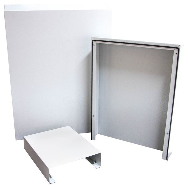 Metall-Abdeckhaube, IP56, als Schutz gegen Sonneneinstrahlungen, gegen Eindringen von Wasser und gegen Vandalismus, für Filterlüfter-Größe 5, verzinktes Stahlblech, lackiert RAL 7035, Abmessungen: (H x B x T) 540 x 410 x 110 mm, Gewicht: 3300 Gramm