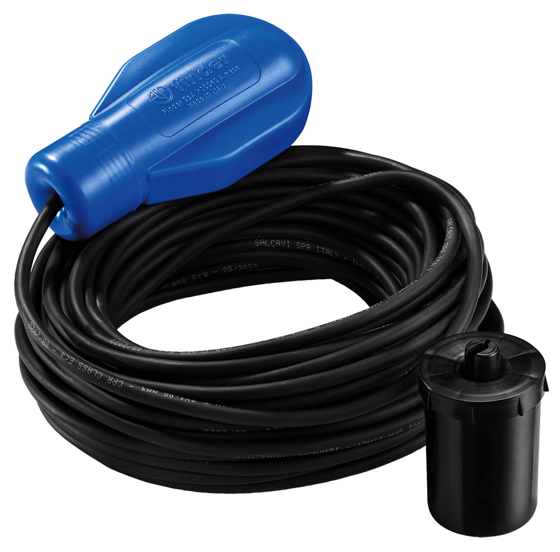 Schwimmerschalter für Tauchpumpen und gering verschmutztes Wasser, 1 Wechsler für 10 A (cos phi 1). Kabellänge 10 m, Kabelmaterial Polychloropren (H07 RN-F), Max. Flüssigkeitstemperatur +45 °C, Gegengewicht (110 Gramm) mit Zugentlastung im Beipack enthalten, Gehäusematerial Polypropylen, Max. Druck 10 BAR, Schalthysterese / Wirkungswinkel +/- 30°, Schutzart IP 68