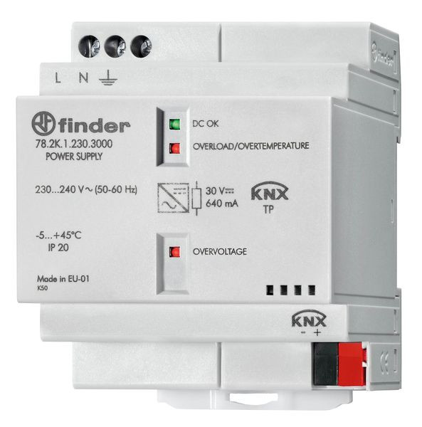 DIN-Schienen Schaltnetzteil für KNX-Bus, Eingang 230-240 V AC, Ausgang 30 V DC 640 mA, mit 3 Diagnose-LEDs, Überlastungs- und Überhitzungsschutz, Breite: 70 mm, für Tragschiene 35 mm (EN 60715).